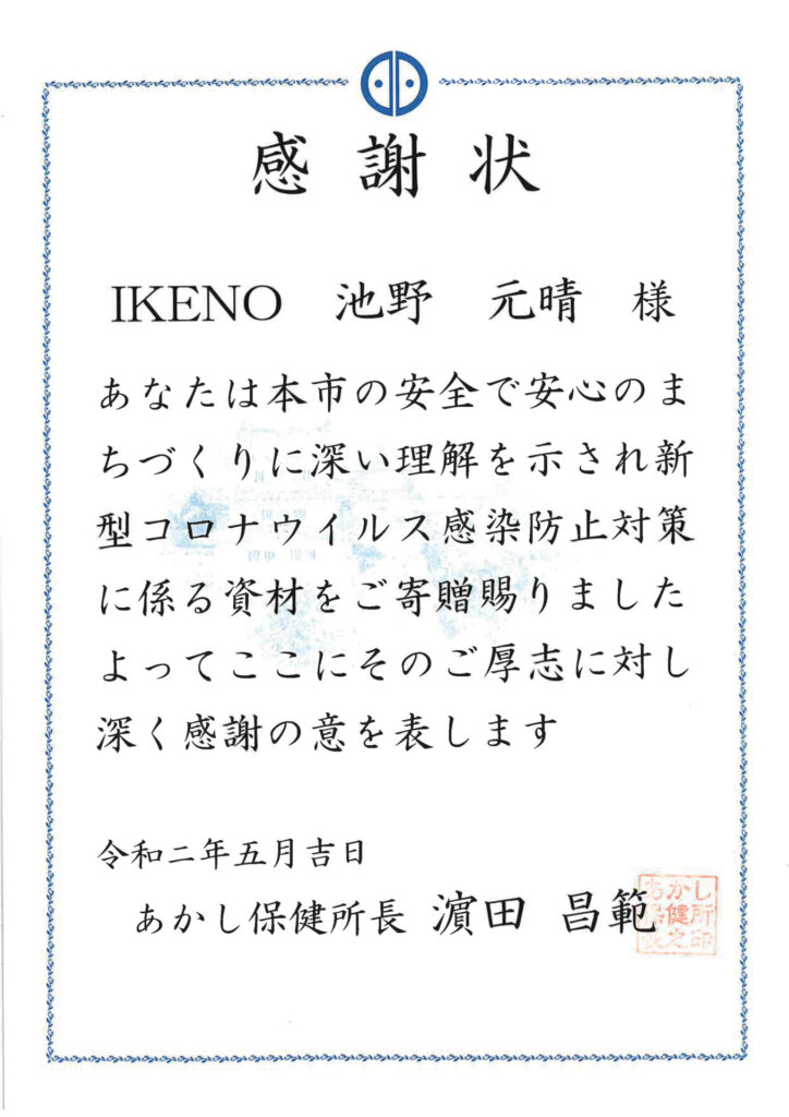 2020.05.07 お知らせ 当社はこの度、「明石保健所」に寄附しました。 当社はこの度、「明石保健所」に寄附しました。 これらの活動を通じて、少しでも多くの方の生活が向上することを願っています。 今後も引き続き、社会貢献活動に取り組んでまいります。 一覧に戻る